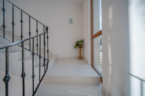 - The fence and railings are made of wrought iron, and the staircases are lined with white granite;