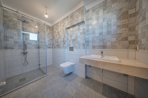 - The facade is finished with travertine stone cladding, external joinery SCHUCO triple glazing.